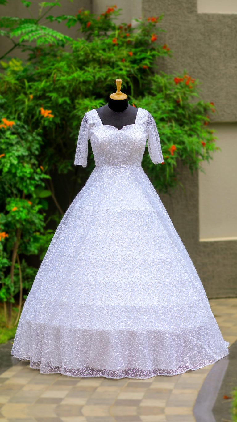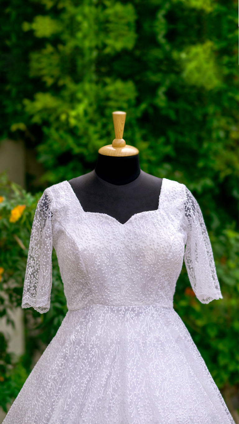 This elegant white bridal gown features stunning sheer sleeves, perfect for a romantic and modern wedding. The gown is crafted with high quality materials and expert design, ensuring a comfortable and flattering fit for the bride-to-be. The sheer sleeves add a touch of sophistication and femininity, making this gown a perfect choice for any bride.
