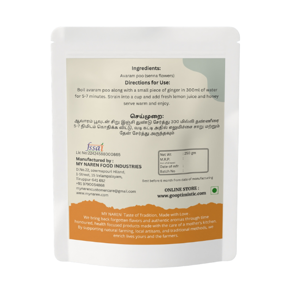 My Naren is a leader in organic nutrition, dedicated to preserving traditional remedies with modern precision. Our Avaram Poo Powder is sourced from organic farms, shade-dried, and finely milled to retain maximum potency. By collaborating with local farmers and artisans, we uphold sustainable practices and empower communities, delivering a product that embodies the nurturing spirit of a mother’s care. This commitment ensures a herbal powder that is both effective and ethically produced.