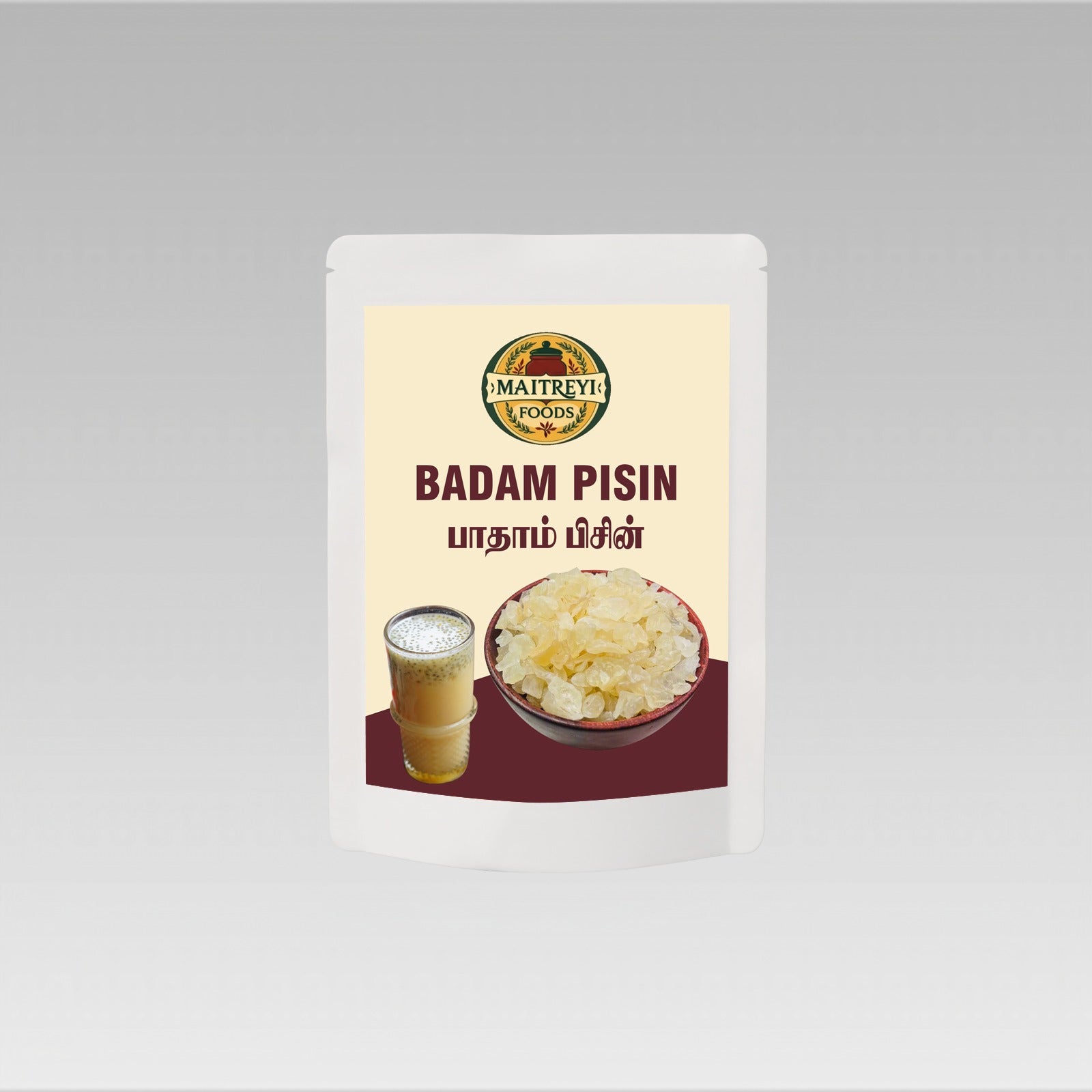 Badam Pisin from Maitreyi Foods, also known as almond gum, is a natural edible resin derived from the almond tree, providing a cooling and hydrating ingredient for beverages and remedies. Available in a 250g pouch, this translucent gum swells into a jelly-like form when soaked, making it versatile for summer drinks and health tonics.