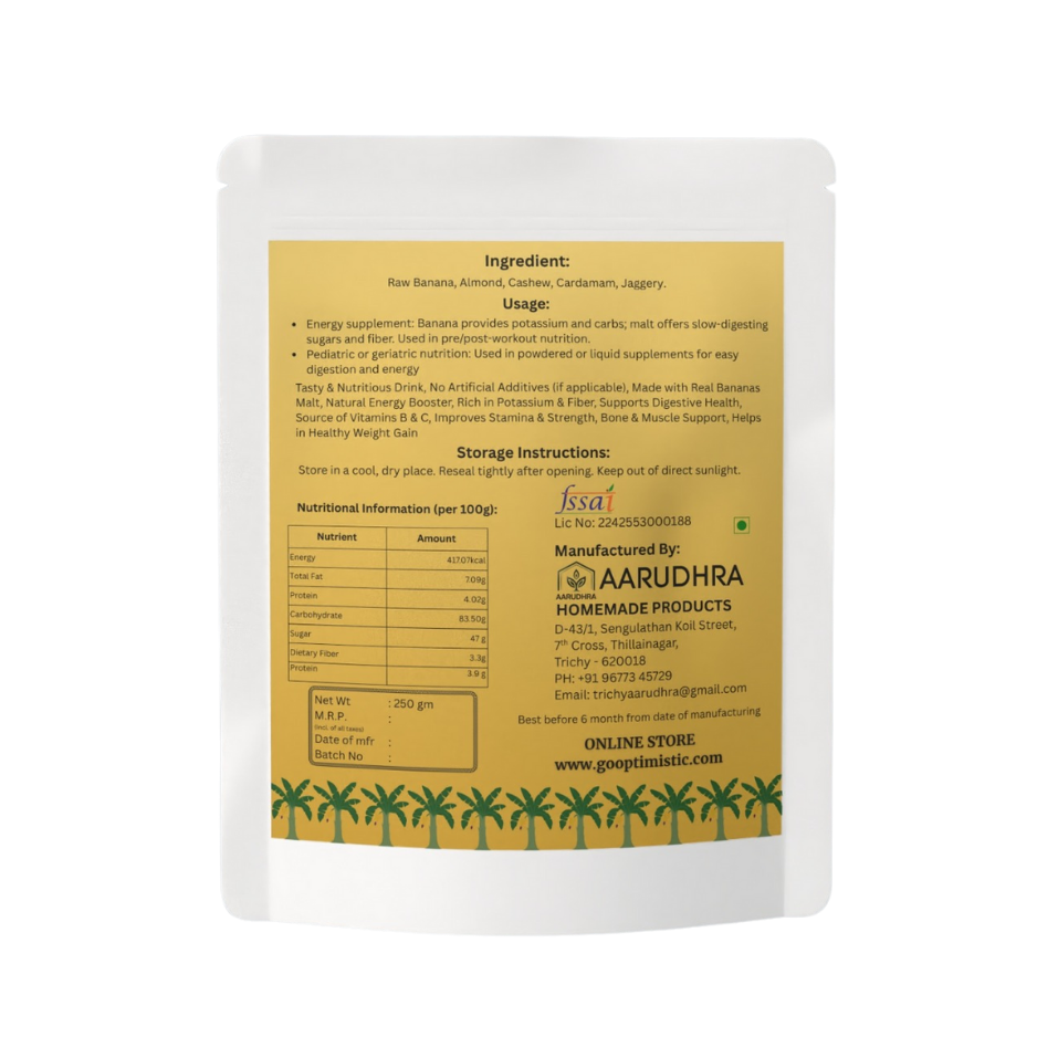 Brand: AARUDHRA Product Category: Natural Energy Supplement Ingredients: Real bananas, almonds, cashew, cardamom, jaggery, no artificial additives Packaging Type: High-quality, resealable pack for optimal freshness Net Weight: 250g Shelf Life: Best consumed within 6 months from the date of manufacturing Certification: Compliant with FSSAI standards (subject to packaging confirmation) Preparation Protocol:
