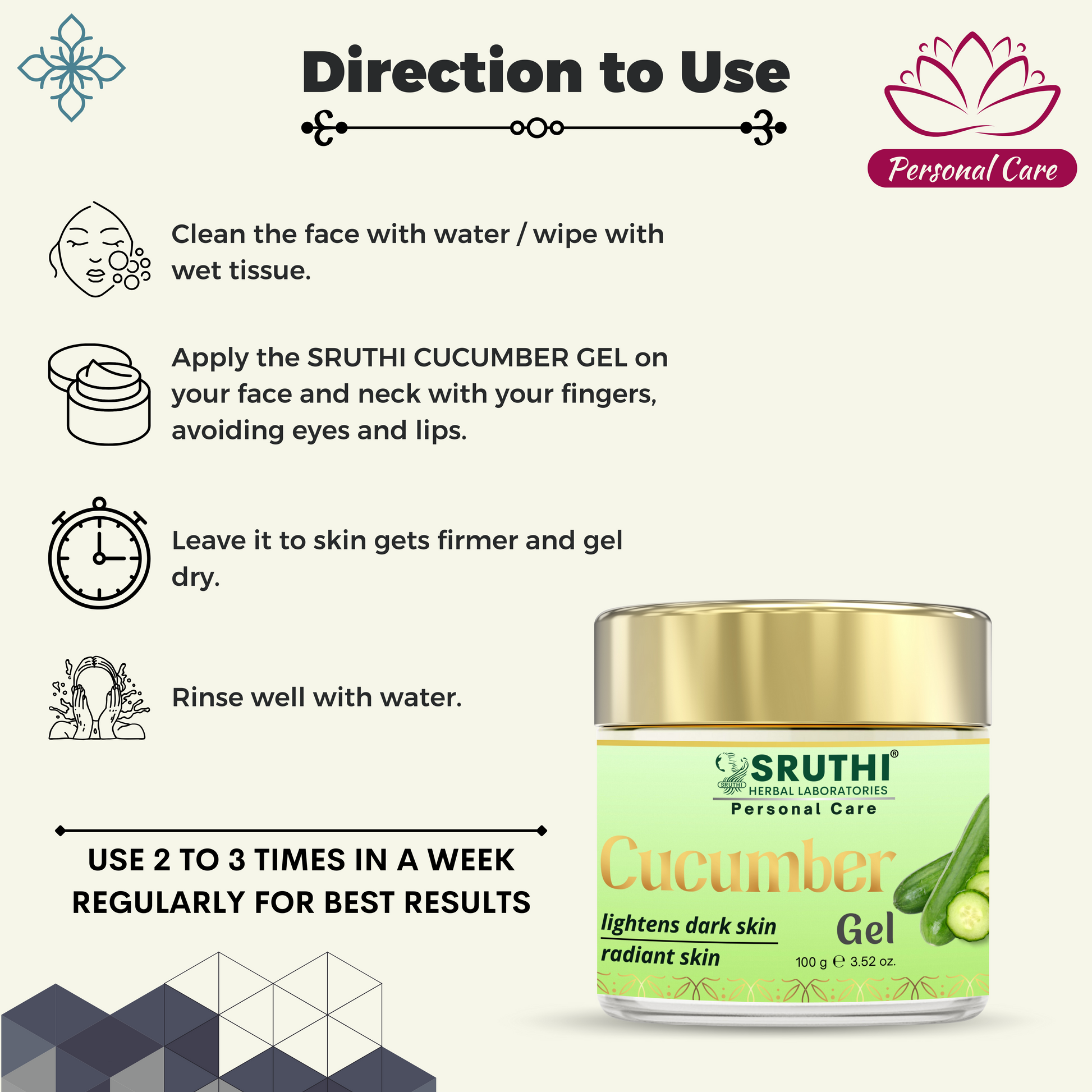 ● Sruthi Cucumber gel with anti-oxidants that reduce the likelihood of redness, puffiness and blemishes for clear, radiant skin. An effective moisturizer that transforms dull, dehydrated skin into healthy skin.