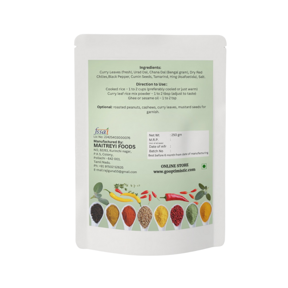 Elevate your idli and rice dishes with Maitreyi Curry Leaf Idly Powder, a perfect blend for authentic South Indian flavors. Order now at www.gooptimistic.com.