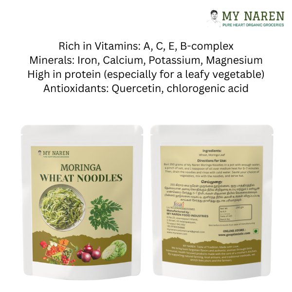 Experience the perfect blend of tradition and health with My Naren Moringa Wheat Noodles, a wholesome organic product crafted with love. Infused with the nutrient-rich goodness of moringa leaves, these noodles offer a delicious and nutritious alternative to conventional pasta. Perfect for health-conscious families and food enthusiasts, this 250g pack brings the authentic flavors of home-made cooking to your table.