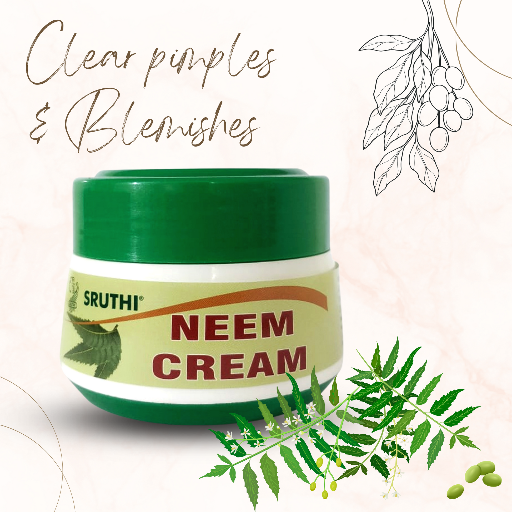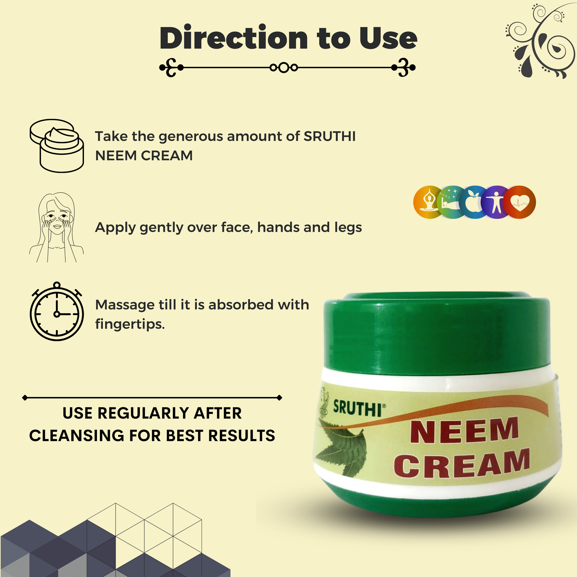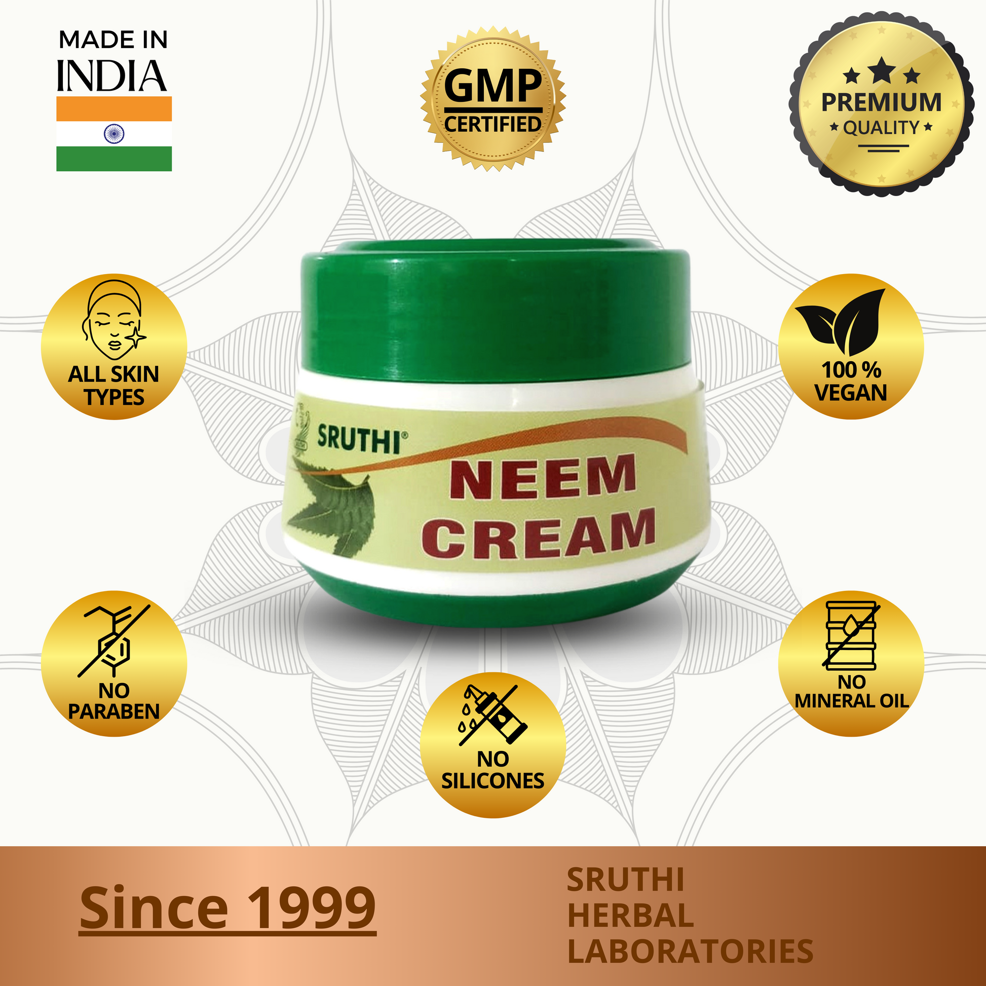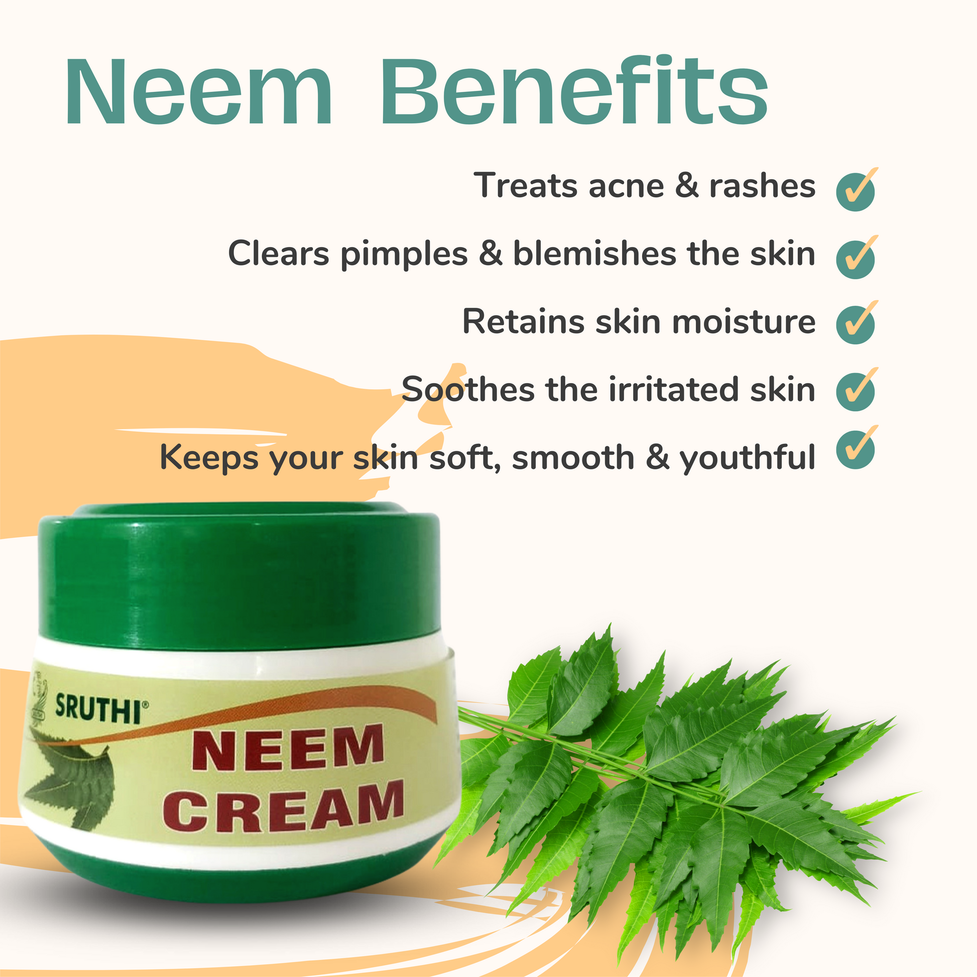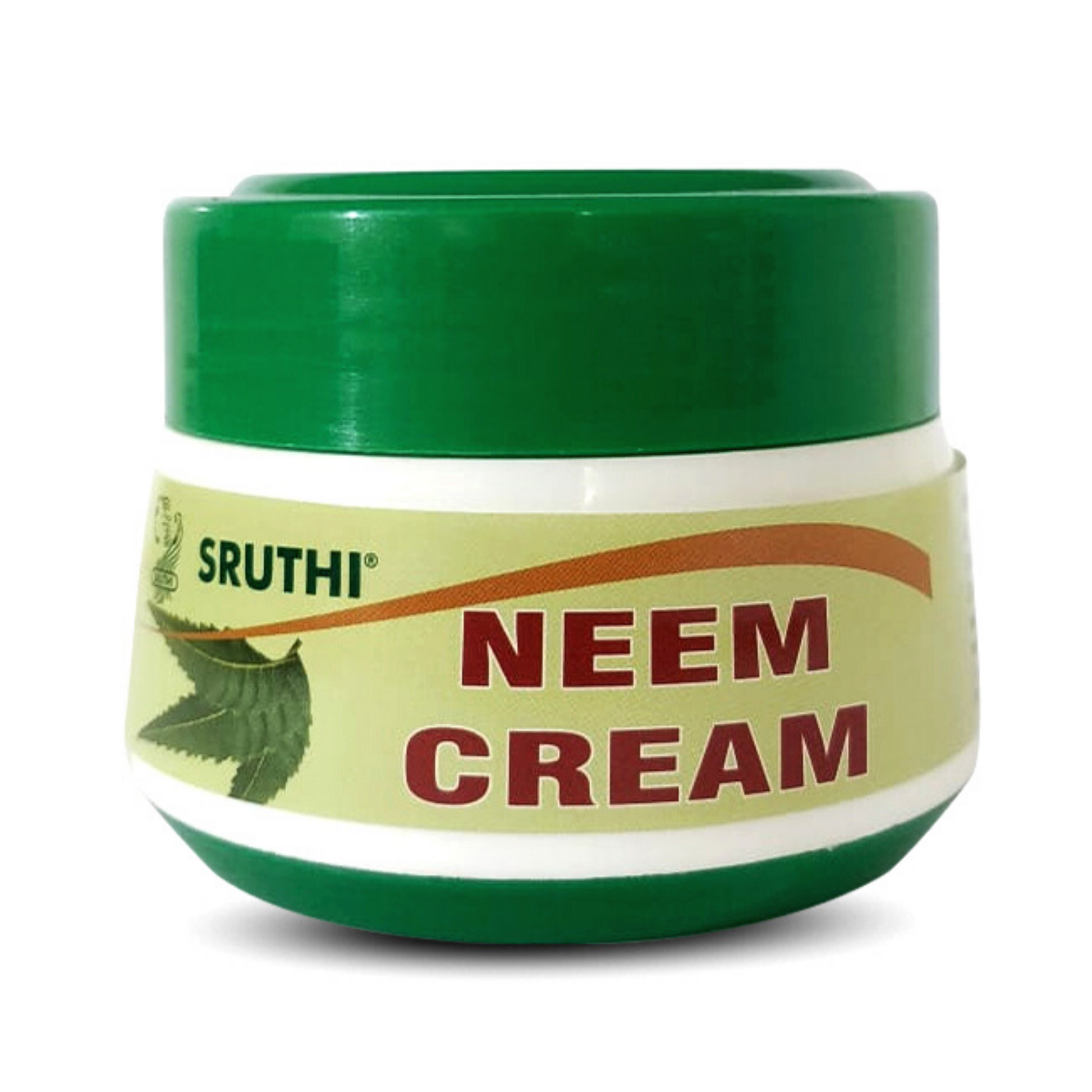 ● Sruthi Neem Cream treats skin issues such as acne, rashes, hyper-pigmentation, while protecting and moisturizing your skin.