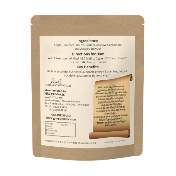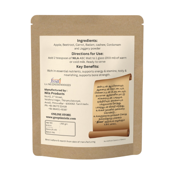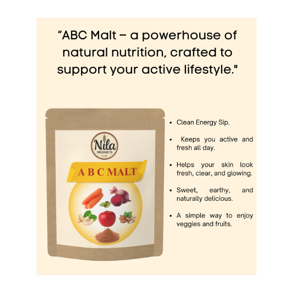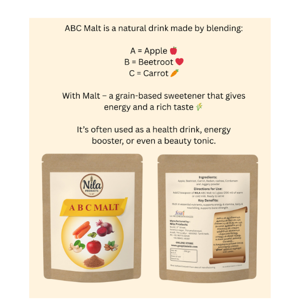 Discover the wholesome goodness of Nila ABC Malt, a natural health drink crafted by Nila Products. This delightful blend combines the finest ingredients like apples, beetroot, carrots, almonds, cashews, and cardamom, enriched with jaggery powder. Perfect for all ages, this malt powder is designed to boost energy, stamina, and overall vitality, making it an ideal addition to your daily diet.