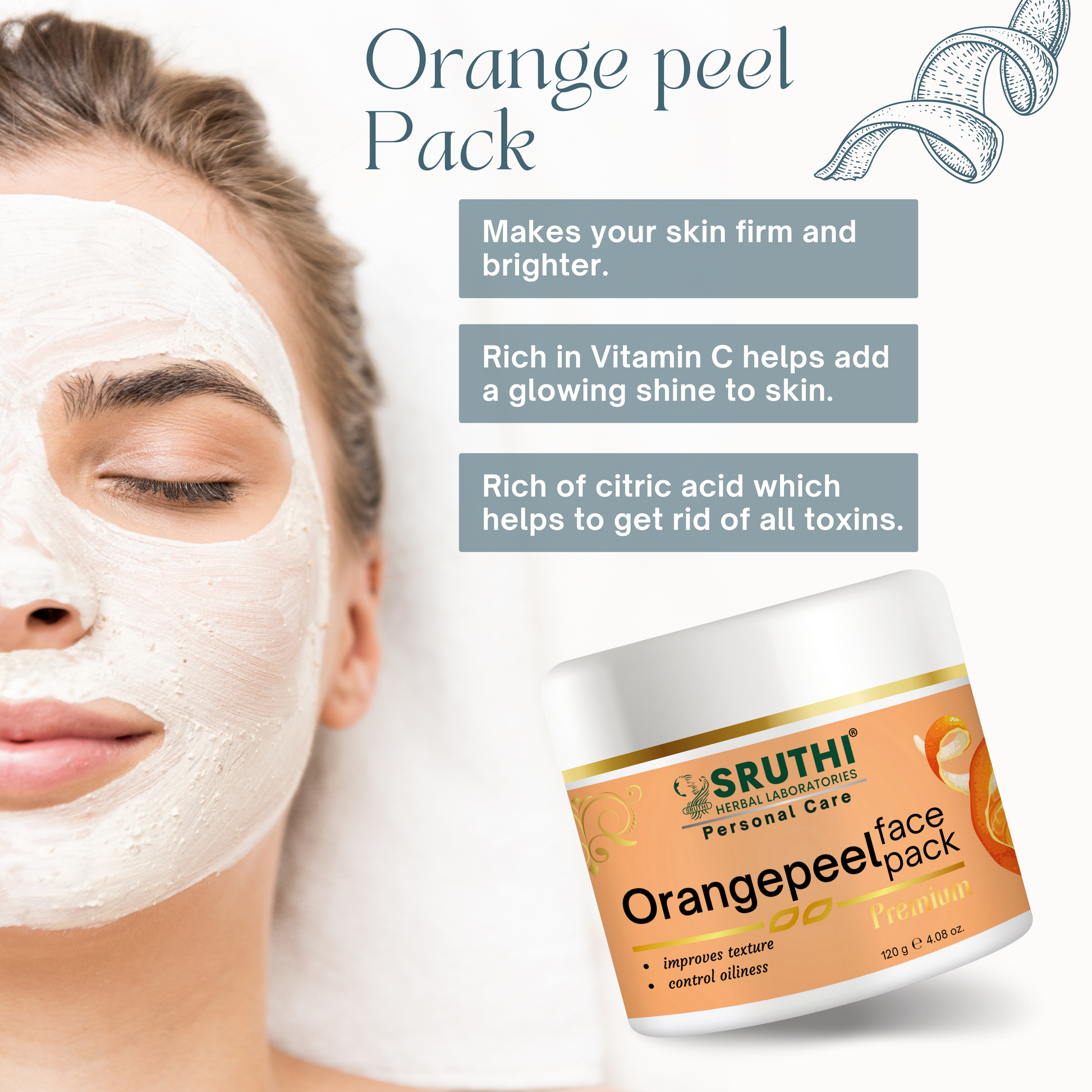 ● Sruthi Orange Peel Face pack is in high content of citric acid which helps to get rid of all toxins, improves texture of skin and refines your pores, control oilness which makes your skin firm and brighter.