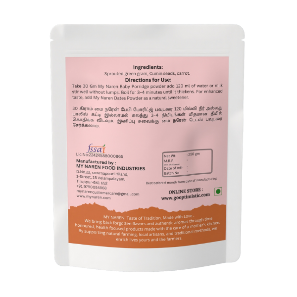 My Naren is synonymous with trust and quality in organic nutrition, prioritizing the health of your little ones. Our Organic Baby Porridge is crafted with certified organic grains, processed in a dedicated facility to ensure safety and purity. By supporting sustainable farming and local artisans, we deliver a product that embodies the care of a mother’s kitchen, providing peace of mind for parents during the critical weaning phase.
