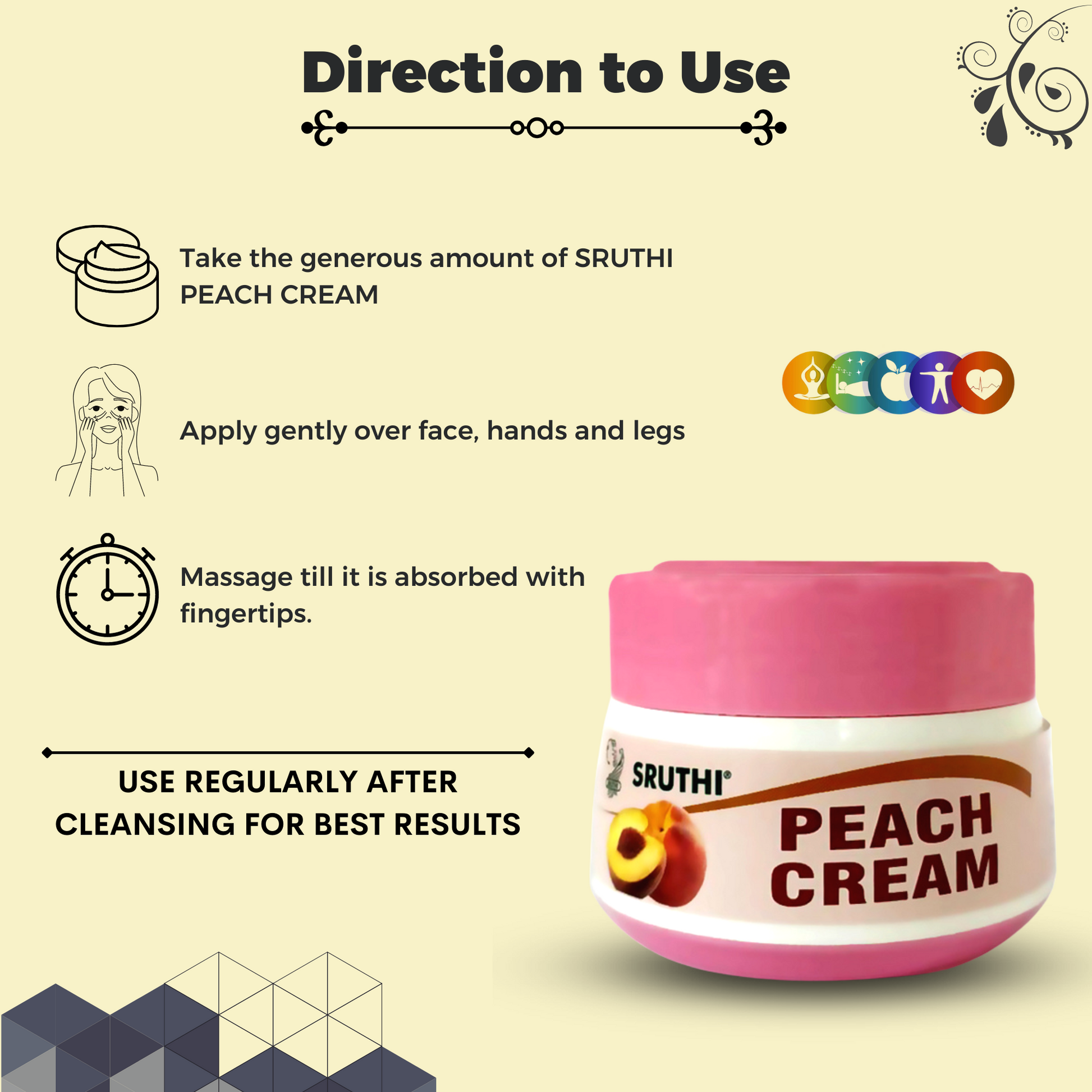 Apply Sruthi Peach Cream gently over face, hands and legs daily, after cleansing.