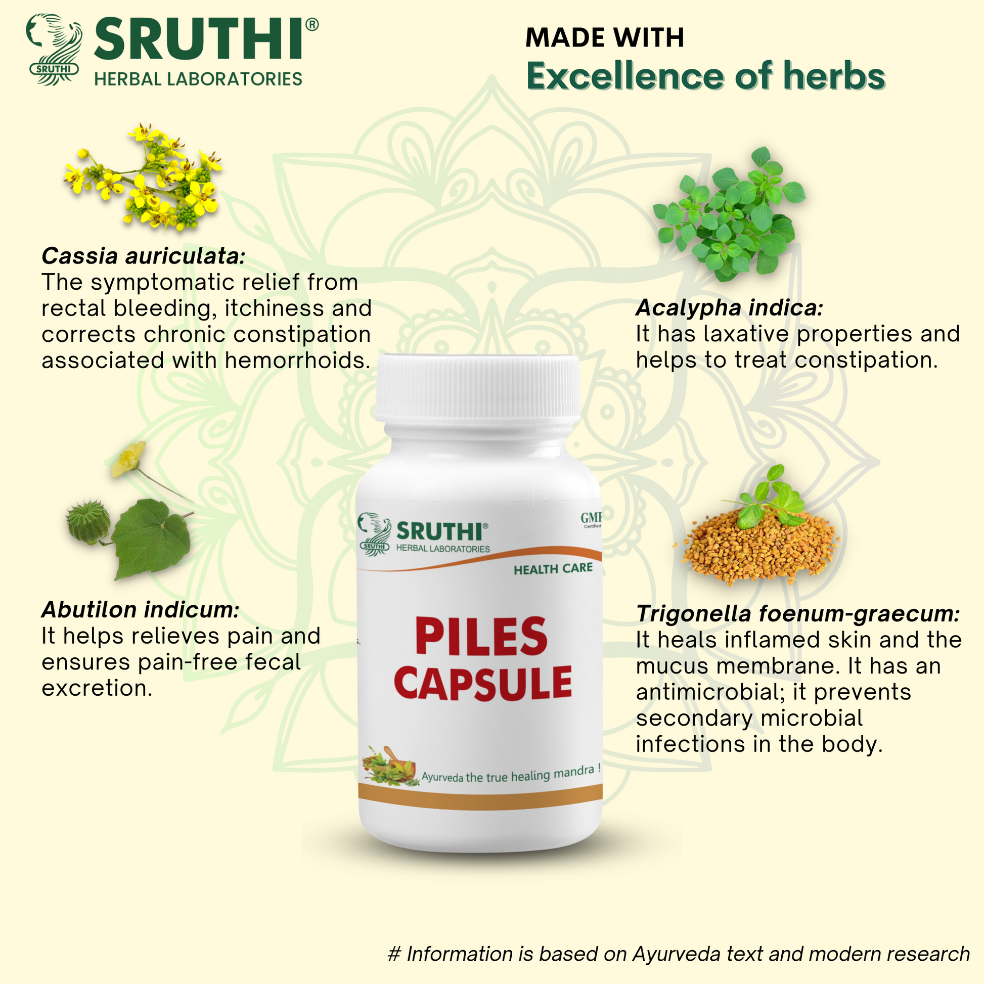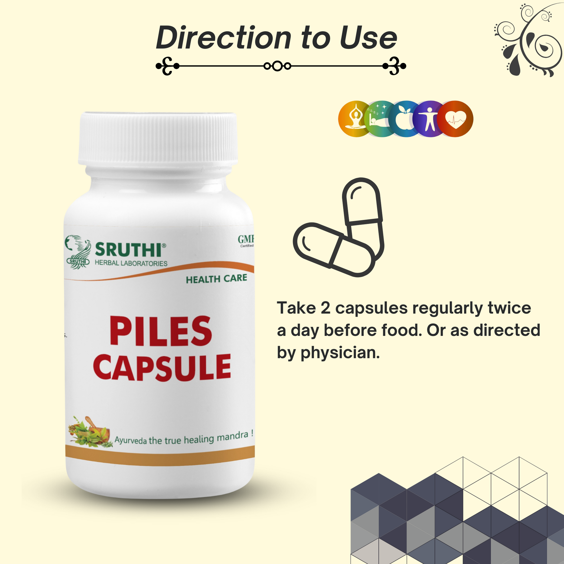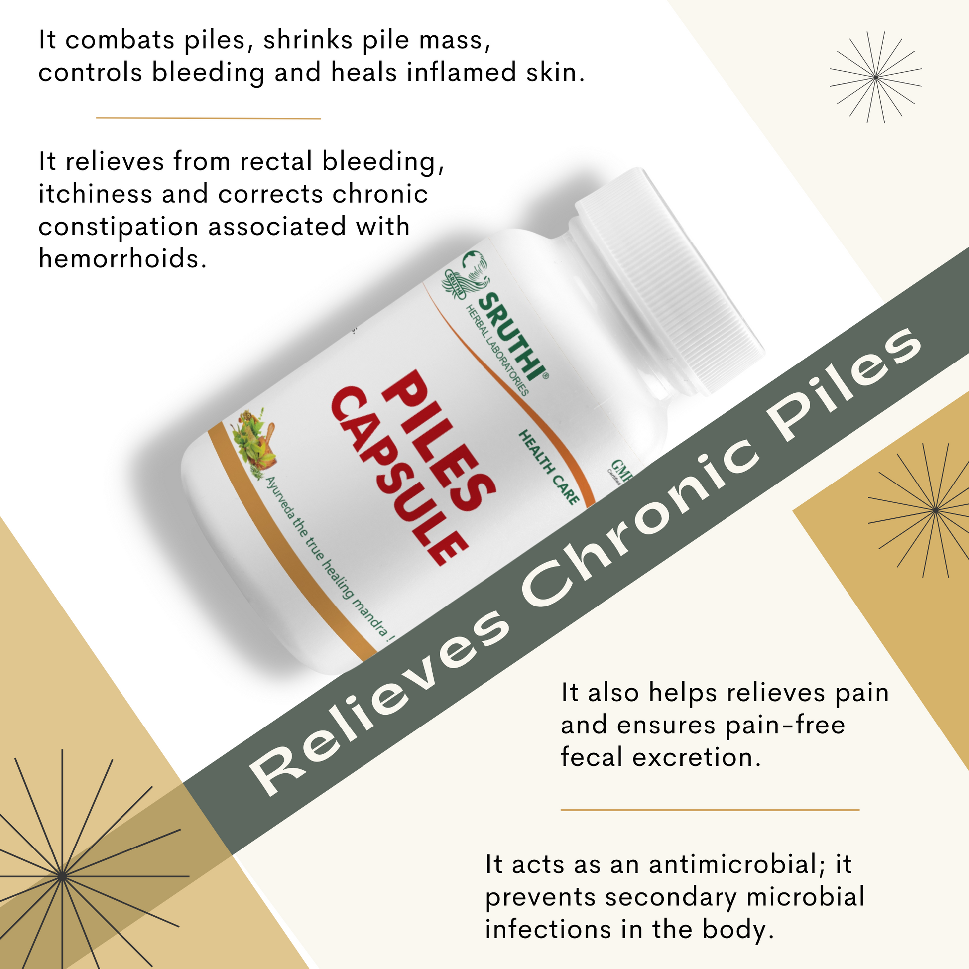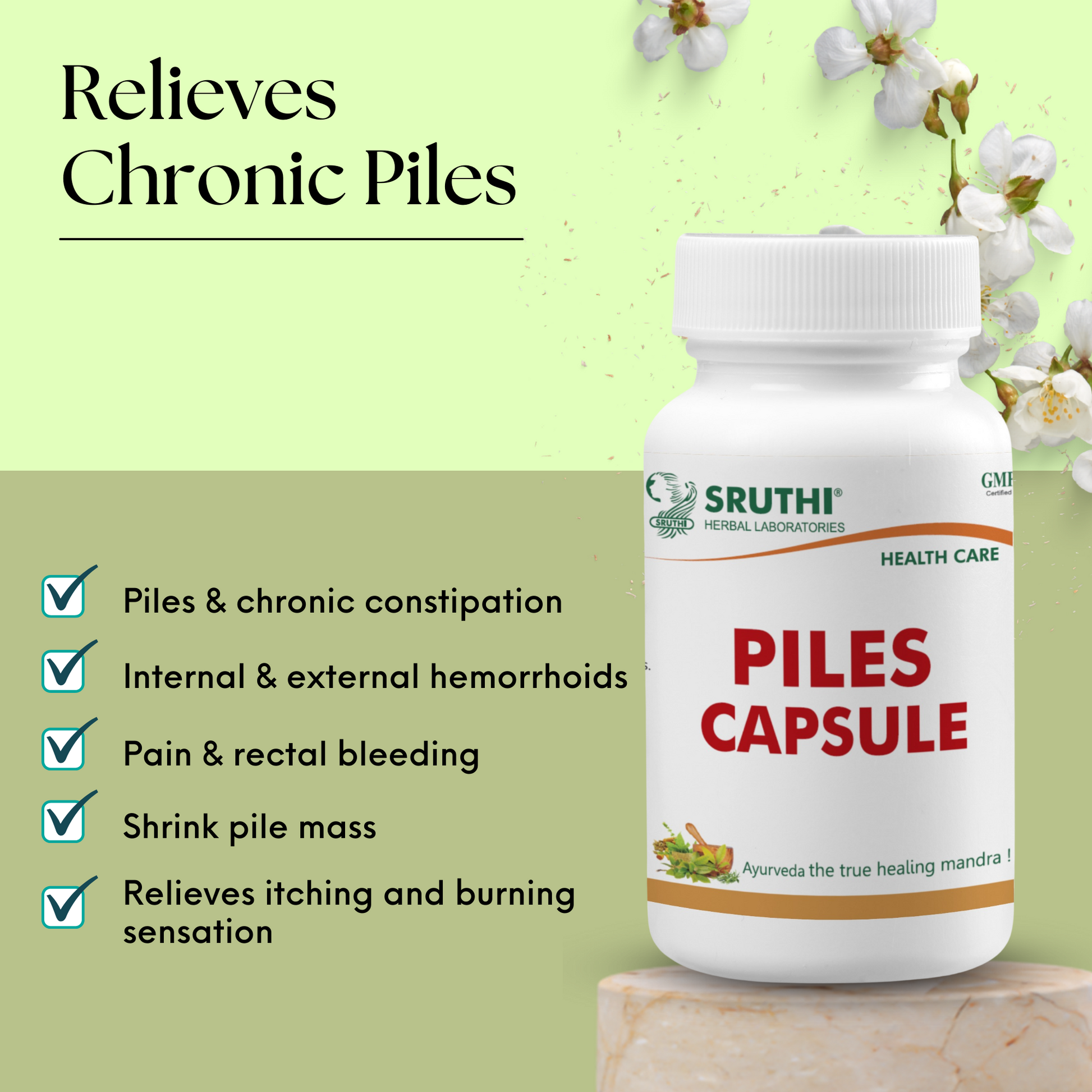 ● Sruthi Piles Capsule combats piles, shrinks pile mass, controls bleeding and heals inflamed skin and the mucus membrane.