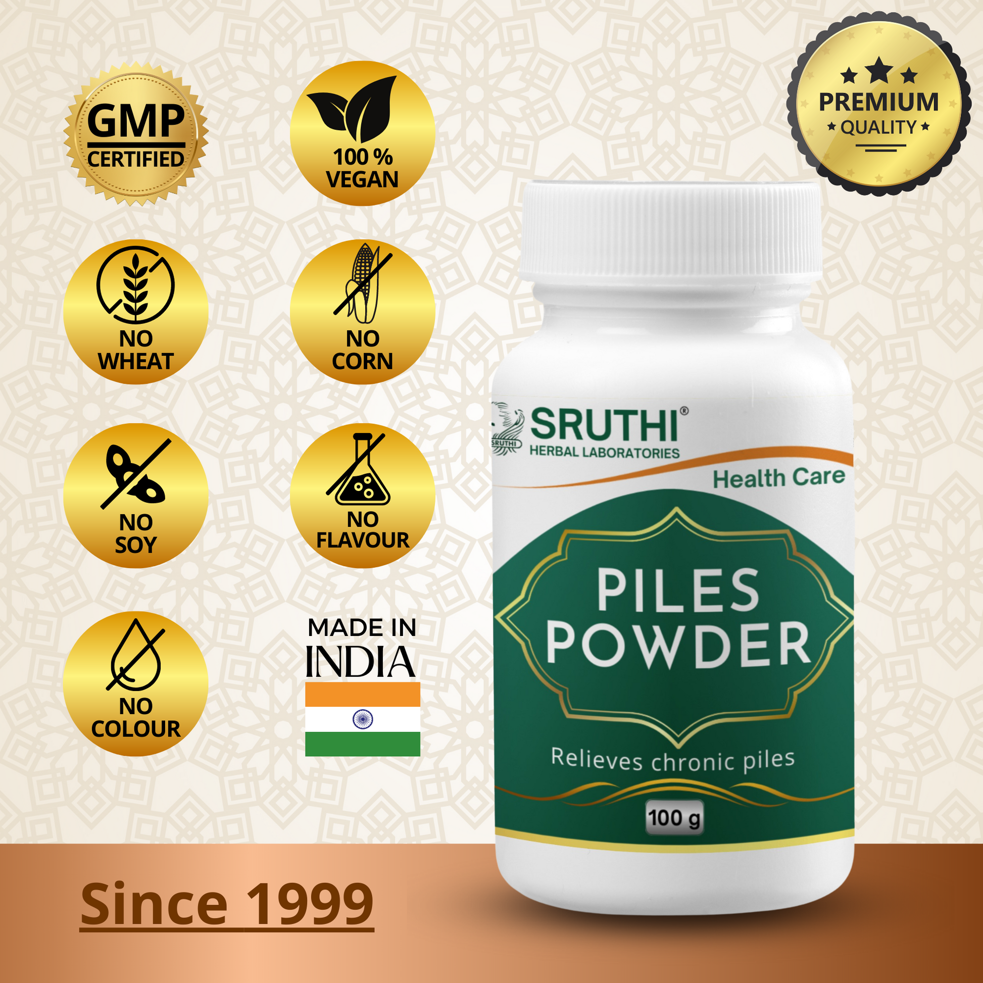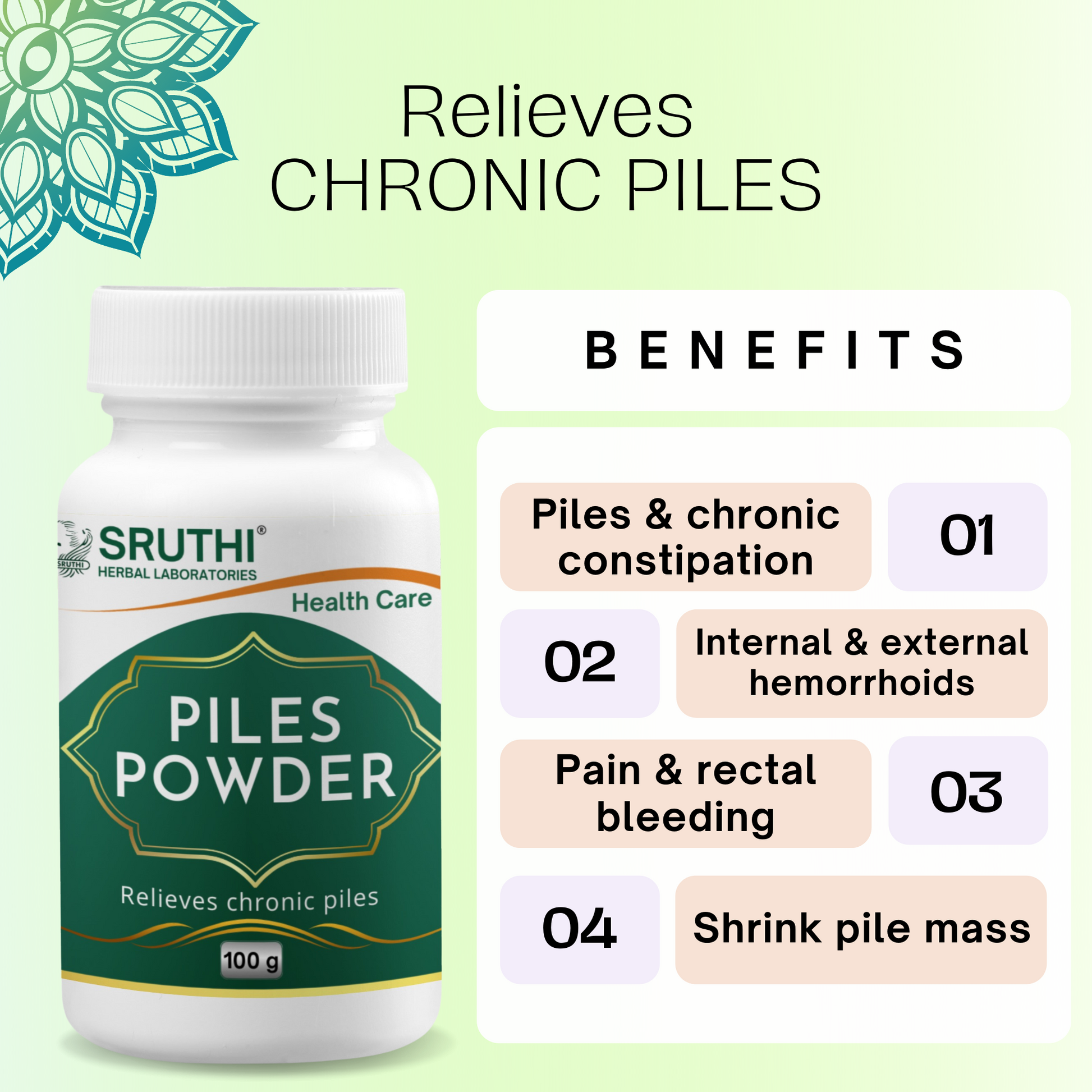 ● Sruthi Piles Powder combats piles, shrinks pile mass, controls bleeding and heals inflamed skin and the mucus membrane.