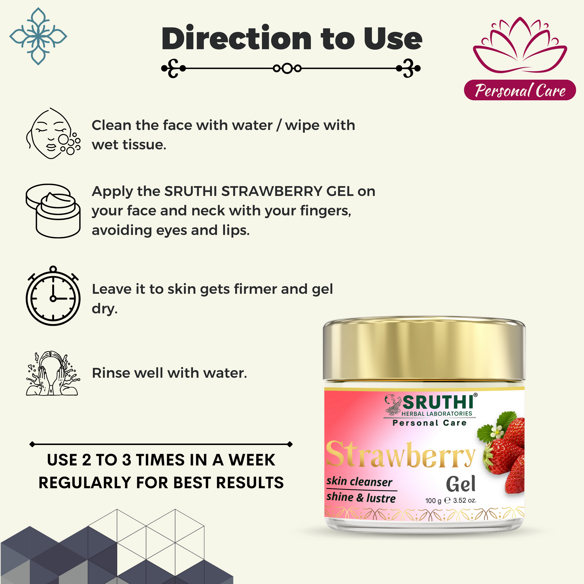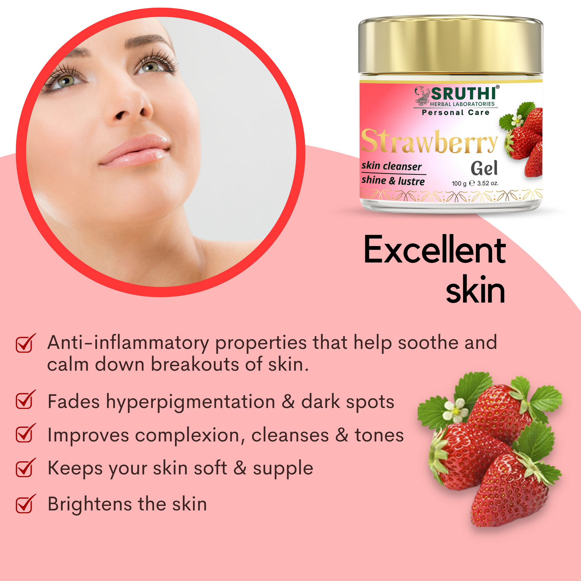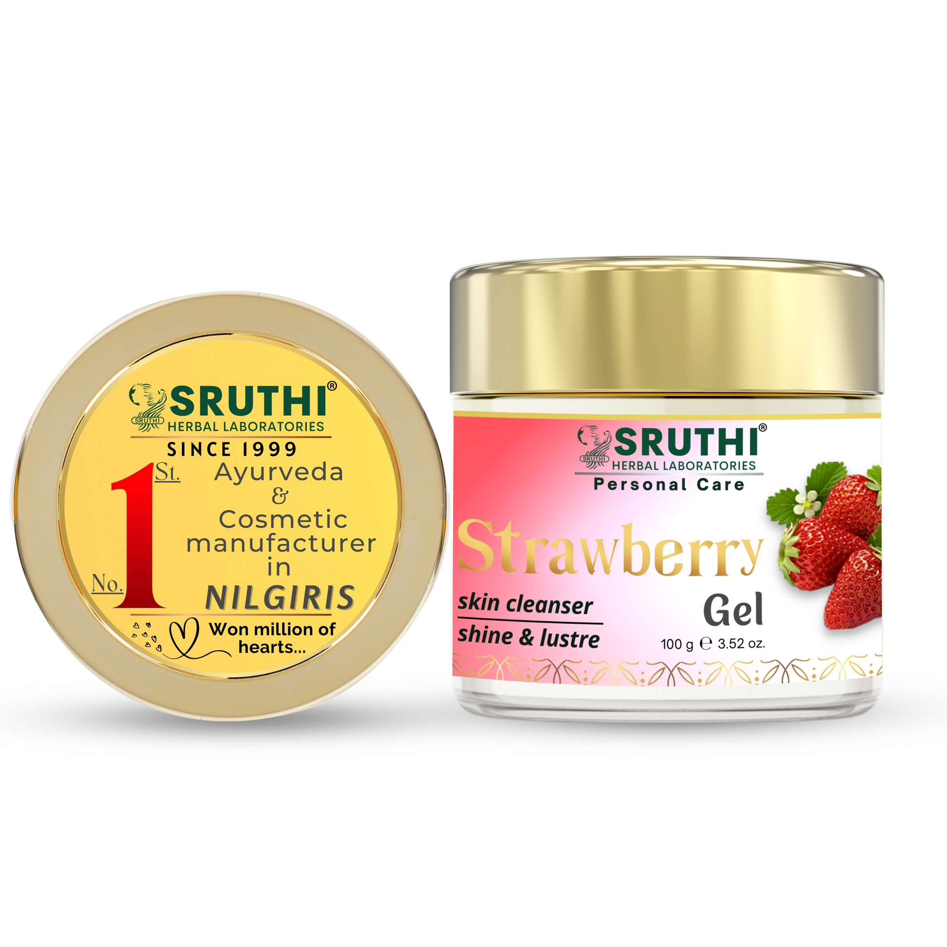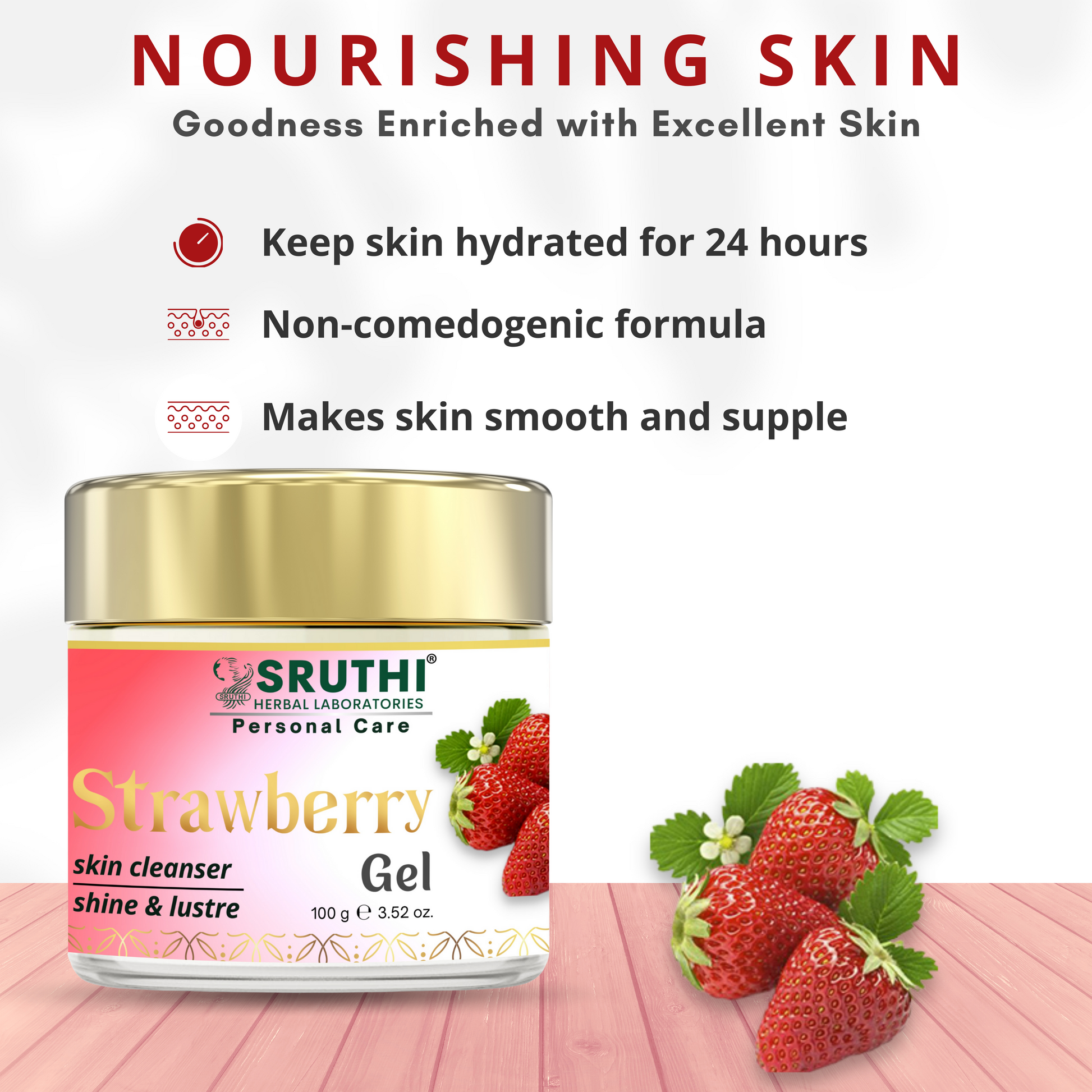 ● Sruthi Strawberry Gel enriched with goodness of rich strawberry extracts is an excellent skin cleanser.