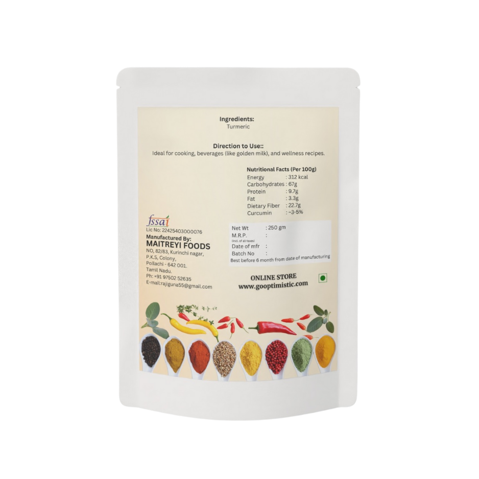 Elevate your cooking and wellness routine with Maitreyi Turmeric Powder, a pure and natural spice derived from premium turmeric roots. Packaged in a 250g resealable pack, this vibrant powder is ideal for enhancing the flavor of dishes, preparing golden milk, and creating wellness recipes. Reflecting Maitreyi’s dedication to quality and tradition, this turmeric powder brings the goodness of nature to your daily life.