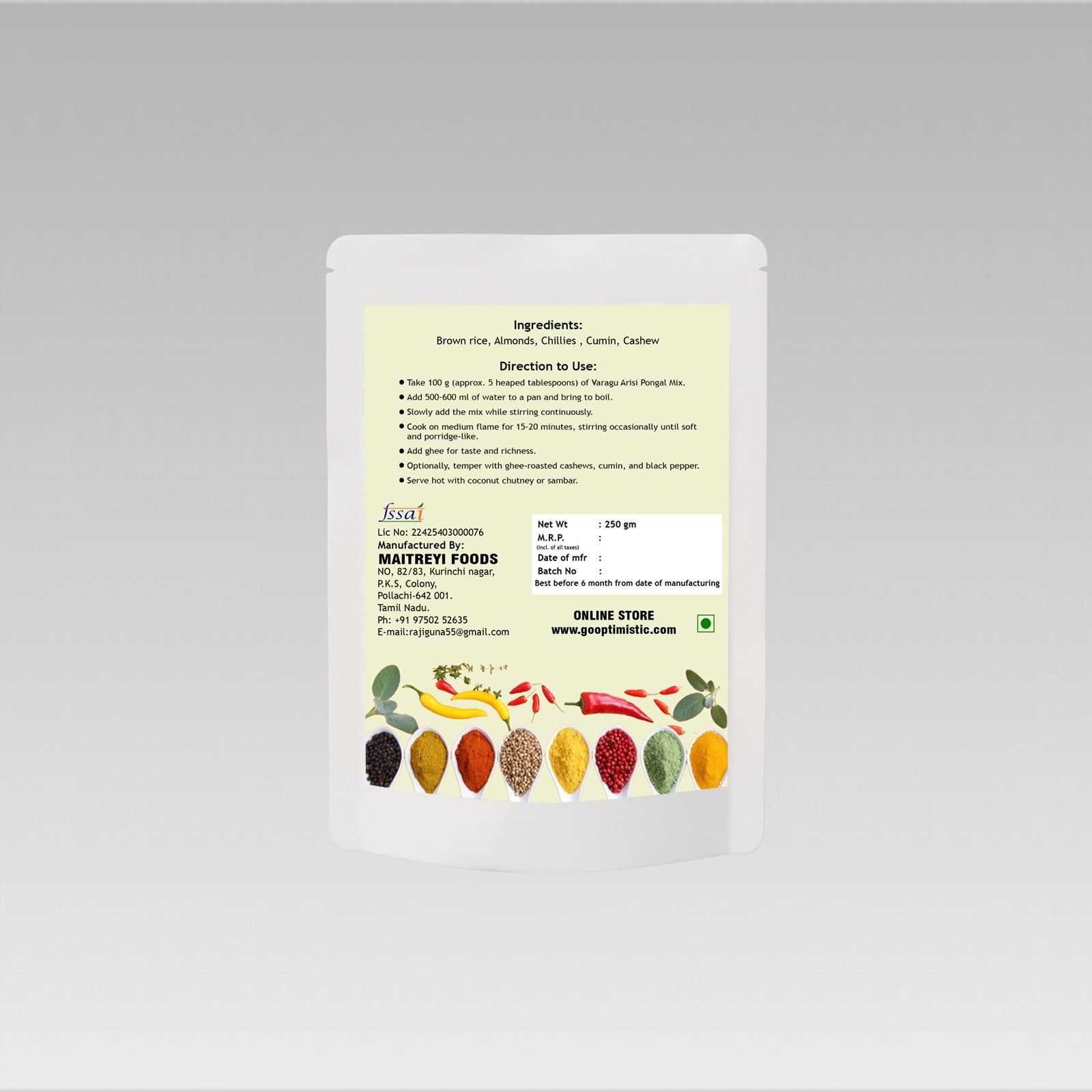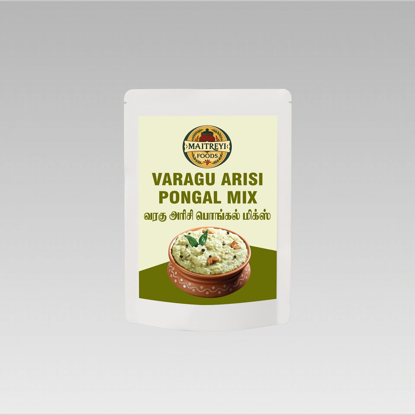 Varagu Arisi Pongal Mix from Maitreyi Foods is a nutritious ready-to-cook blend featuring kodo millet (varagu arisi) for preparing traditional South Indian pongal, a savory porridge dish. Packaged in a 250g pouch, this mix offers an easy way to enjoy the earthy, wholesome flavors of millets combined with spices and nuts, ideal for quick meals with authentic taste.